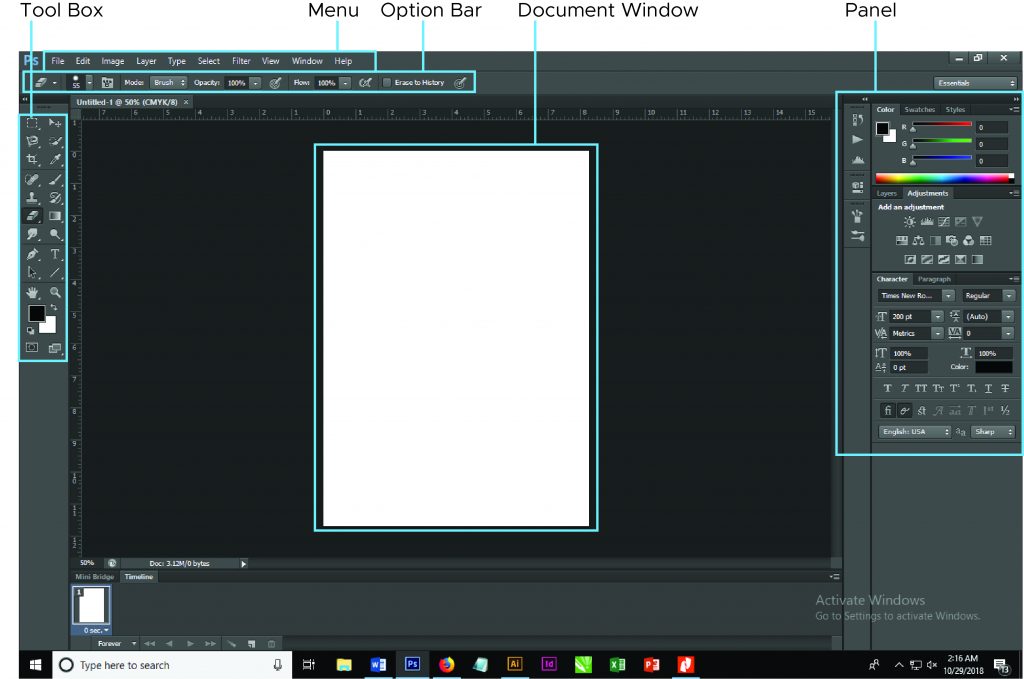 4. Document Window: lembar kerja utama yang berisi objek yang sedang diedit, bisa berupa gambar, teks atau objek lainnya. Bagian ini dapat berisi banyak dokumen berupa tab yang memungkinkan kita berpindah antar dokumen dengan mudah.
