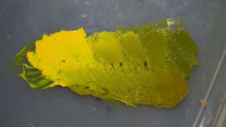 mulailah dengan warna tabung saya – dalam contoh ini Yellow Lake – dan kemudian cari warna komplementernya, Ultramarine Violet. Semua bayangan memiliki unsur biru, jadi saya memilih Ultramarine Blue karena warnanya hangat dan bersandar lebih ke arah bunga violet dan merah. Kami tidak ingin bayangan kuning kami terlalu hijau.