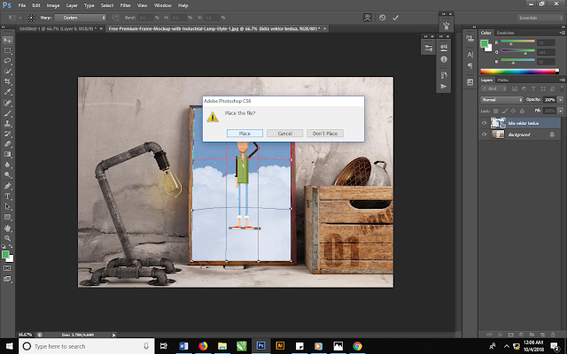 2. Setelah didownload, buka aplikasi Adobe Photoshop. Lalu pilih menu option, file > new. Lanjut lagi pilih file > place, pilih file mockup > place.