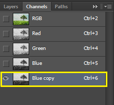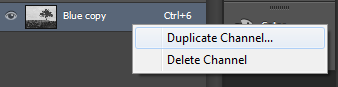 Nah, karena kita mau menyeleksi pohon, dimana backgroundnya langit warna biru, maka dari itu kita fokus ke Blue Channel. Duplikat Blue Channel dengan cara klik kanan>duplikat channel.