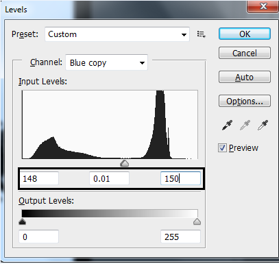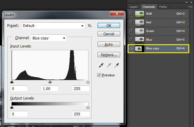 Langkah selanjutnya adalah setting pohon supaya pohon menjadi warna hitam, langit warna putih. Dengan cara klik blue copy>Ctrl+L untuk keluarkan levels lalu setting sesuai tujuan diatas.