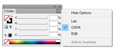 7. Di kedaan standar, warna yang ditampilkan di jendela color hanya hitam-putih. Untuk menampilkan warna, anda dapat menekan tombol garis seperti paragraph dan menekan menu RGB atau CMYK.
