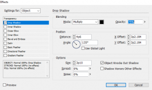 - untuk memberikan efek Drop shadow, anda harus memilih objeknya terlebih dahulu, kemudian tekan menu object > Drop Shadow, bisa juga dengan melakukan klik kanan kemudian tekan menu Drop Shadow atau dengan menekan tombol ALT+CTRL+M di keyboard sehingga muncul jendela Drop Shadow.