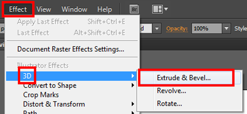 Langkah selanjutnya, setelah selesai setting tulisan, kita langsung berikan efek 3D pada tulisan tersebut, yang pasti jangan lupa diseleksi tulisannya (tidak perlu di blok cukup di klik saja pada bagian tulisan). klik Effect > 3D > Extrude & Bevel.