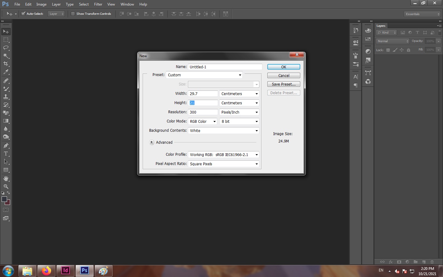 Pertama Buka Software Adobe Photoshop, klik new lalu buat ukuran A4 dengan orientasi Lanscape