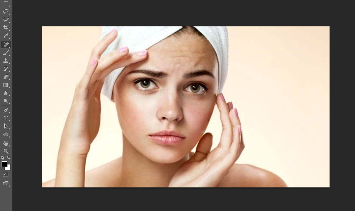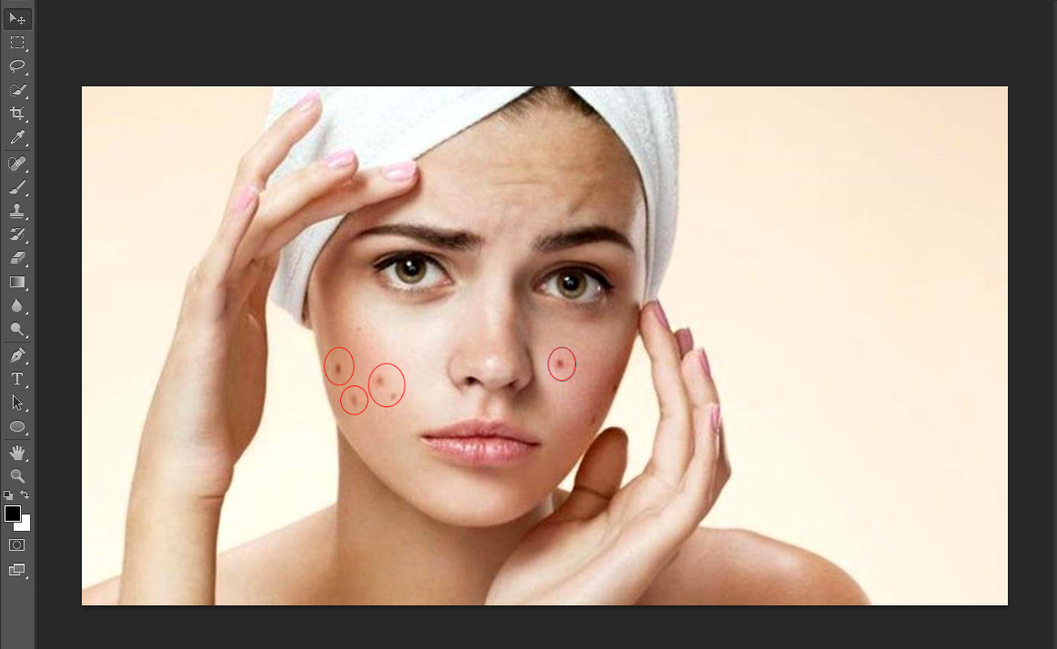 3. Lanjut ke proses inti yaitu menghapus jerawat nya ya teman-teman. Caranya mudah ko, hanya dengan menggunakan Spot Healing Brush Tool . Caranya dengan  klik J dan mulai lah mengedit gambar dengan hanya menggosokan pada area jerawat nya  ( Perhatikan gambar dibawah ini  )